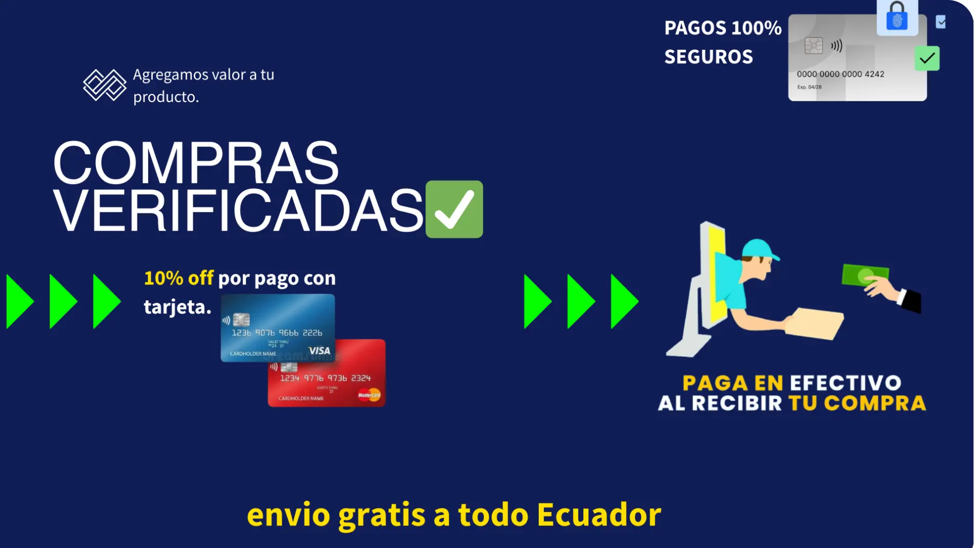 Para tu mayor tranquilidad, ofrecemos pago al recibir tu pedido y pagos con tarjeta de crédito o débito. Además, como beneficio especial, los pagos realizados con tarjeta cuentan con un porcentaje de descuentos, permitiéndote ahorrar mientras compras de forma rápida y segura.