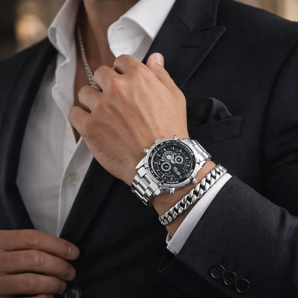 Reloj de Lujo: Diseño robusto con acabado metálico de alta calidad y dial detallado.